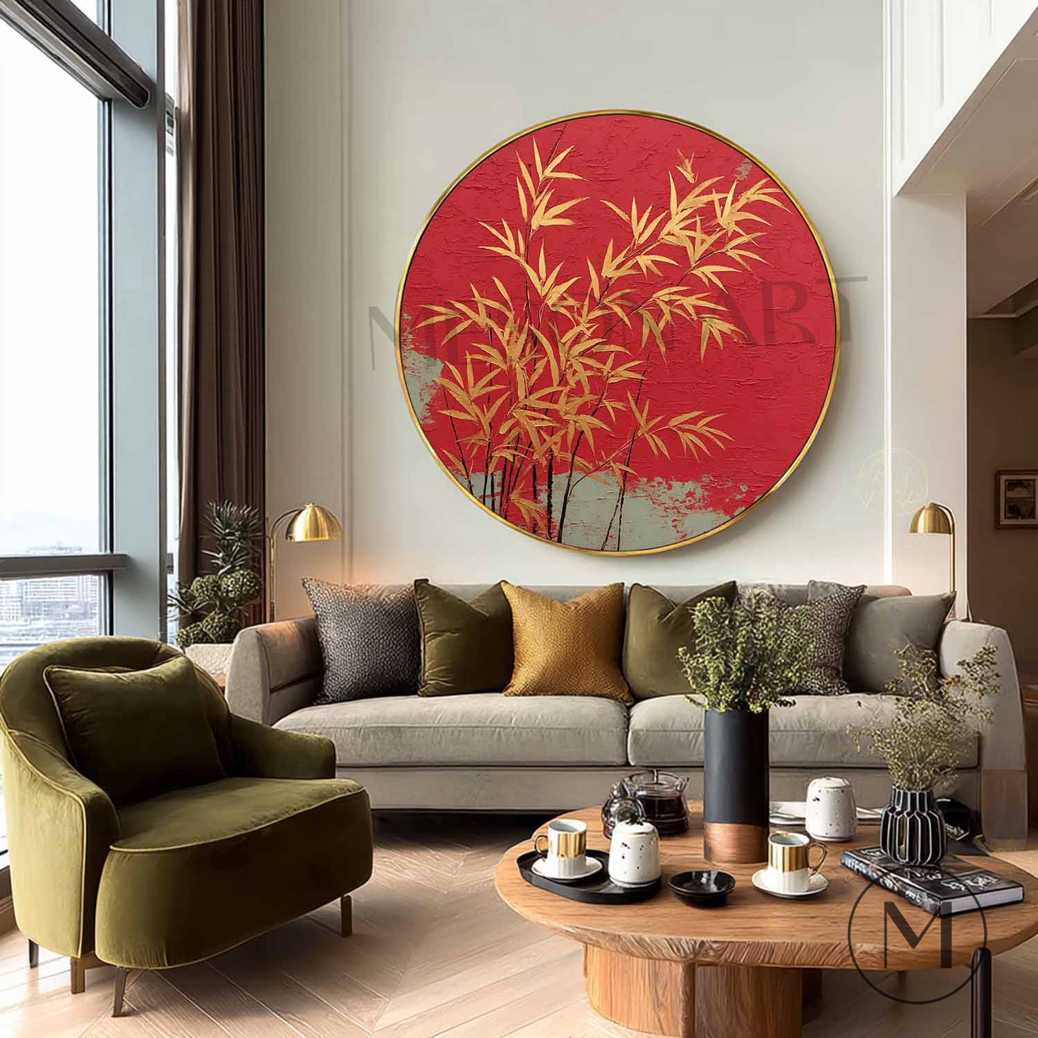 Luxury Round Wall Art with Bamboo Oriental Minimalist Zen Gold Bamboo on Red Textured Canvas