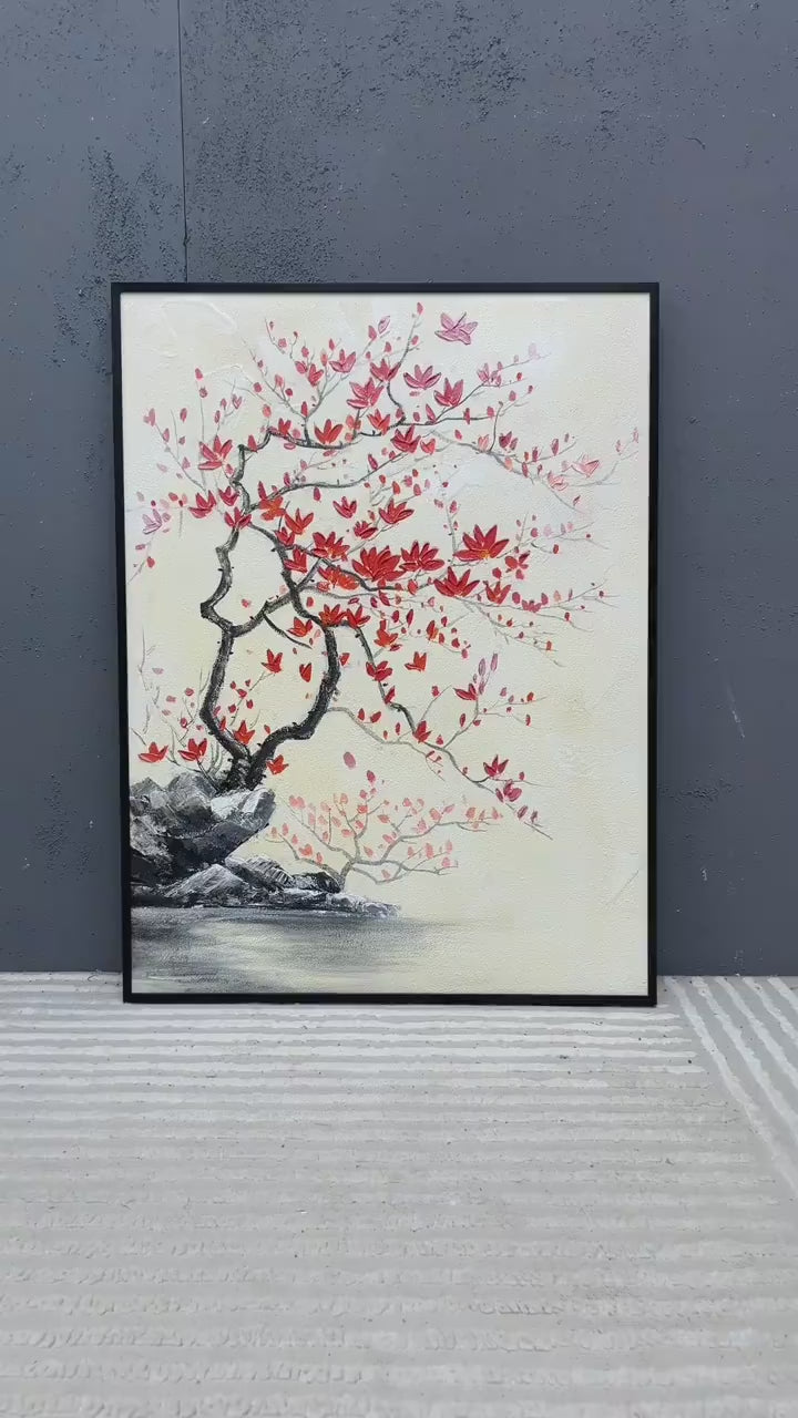 Red Flower Texture Painting Wabi-Sabi Wall Art Japanese Flower Painting on Canvas